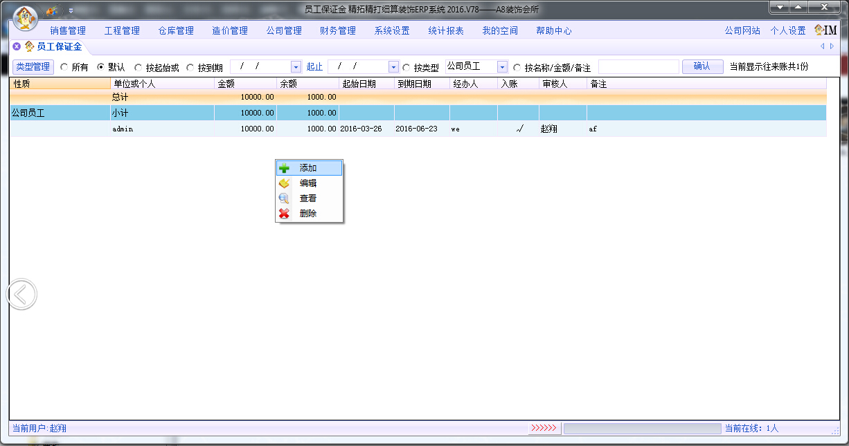 保證金通過審核之后,在保證金收款情況里面點擊添加,將已經(jīng)收的3萬元記錄,然后等待審核通過即可。(注:該保證金收取的費用等審核之后就進入財務(wù)日記賬了)