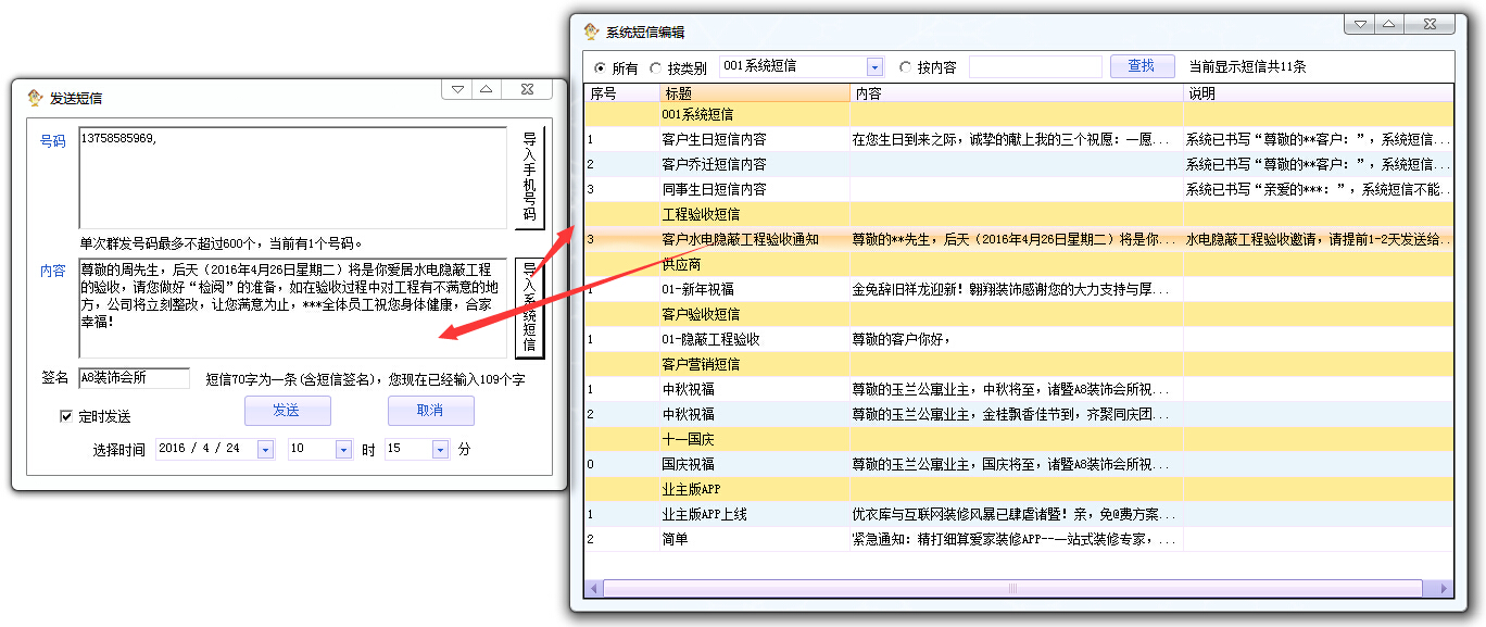 右鍵添加短信、選擇或者填寫短信類別,編輯標(biāo)題和內(nèi)容,添加即可。